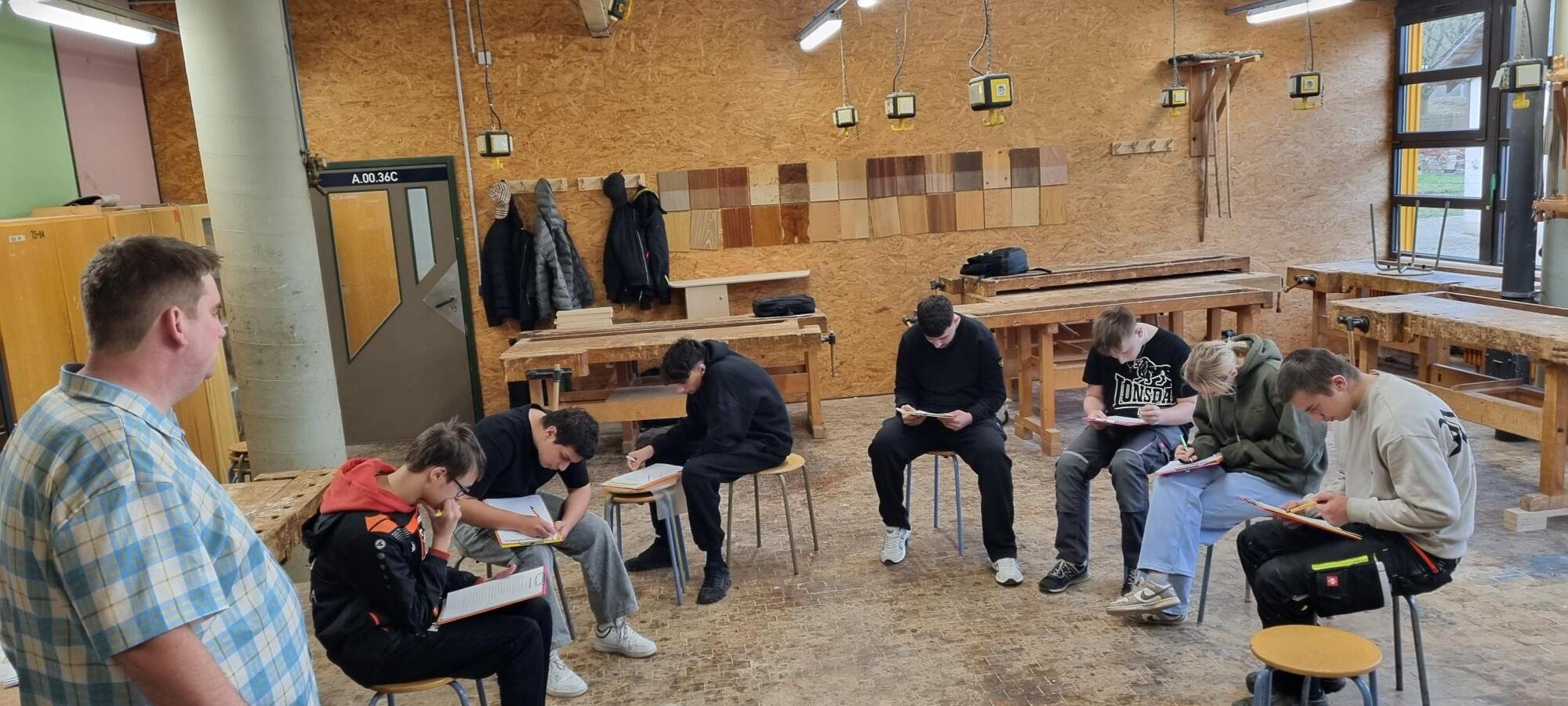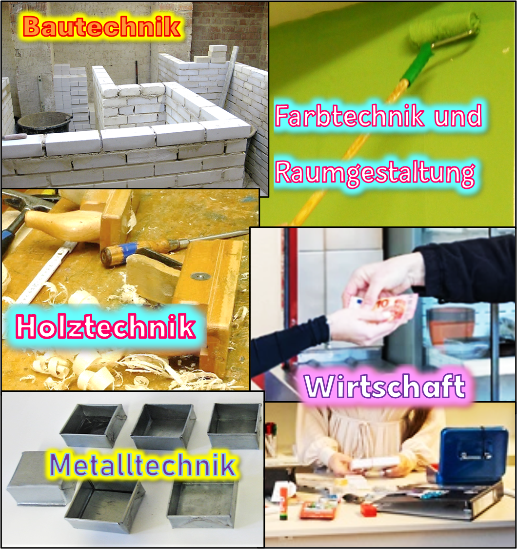 Es werden die Berufsfelder Bau-, Farb-, Holz- und Metalltechnik in der Fachtheorie und Fachpraxis in den Werkstätten erarbeitet.Fachrichtung Wirtschaft